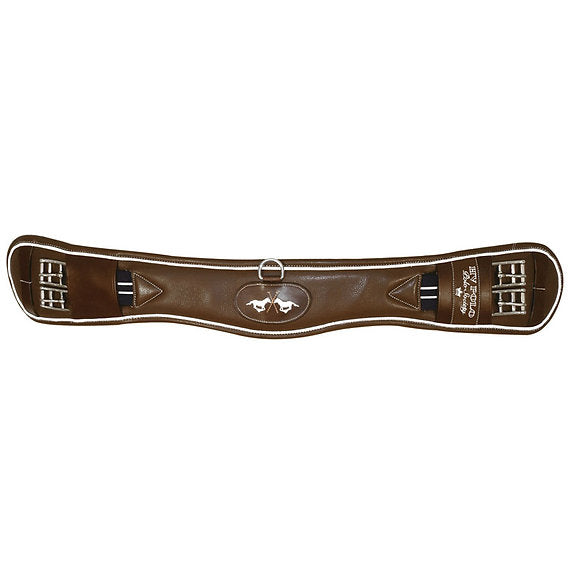 Leather dressage girth with elastic parts at both ends, contrast coloured piping and with a centre D-ring. A truly stunning luxury girth.